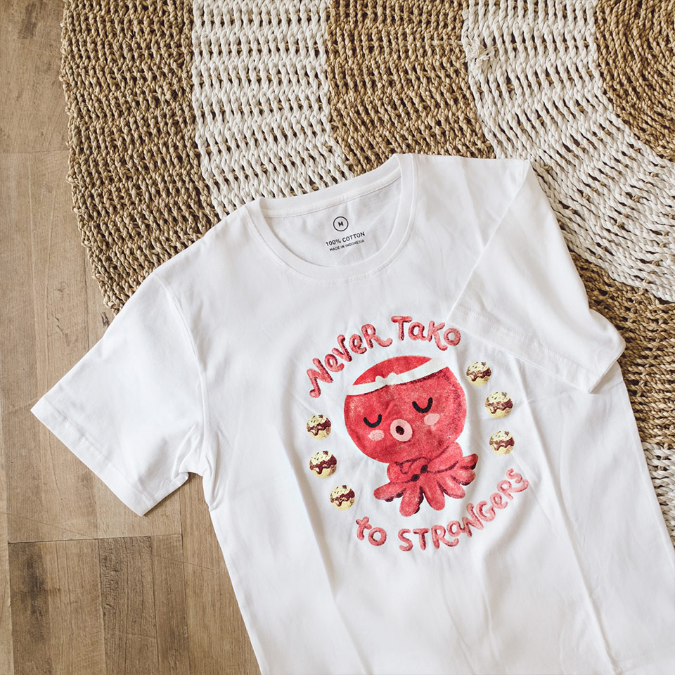 Pesan berharga “Never Tako to Strangers!”, dari si Cumi-cumi merah menghiasi t-shirt 100% cotton ini diiringi keceriaan kue takoyaki di sekelilingnya, menghadirkan t-shirt yang lucu sekaligus nyaman dikenakan.
